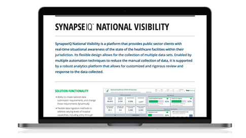 SynapseIQ® Bundesweite Sichtbarkeit bietet Institutionen im öffentlichen Sektor ein umfassendes Echtzeit-Situationsbewusstsein über den Zustand ihrer Gesundheitseinrichtungen im gesamten Zuständigkeitsbereich. Das flexible Design ermöglicht die Erfassung mehrerer Datensätze und nutzt unterschiedliche Automatisierungstechniken, um manuelle Datenerfassung deutlich zu reduzieren.